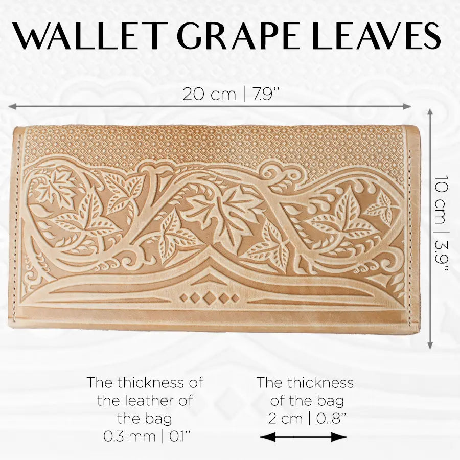 Experience the perfect combination of style and functionality with our large and roomy 'Grape Leaves' wallet. Crafted from genuine leather, this wallet is a must-have accessory for women who appreciate quality and beauty. Whether you're treating yourself or searching for a thoughtful gift, this wallet is sure to impress.