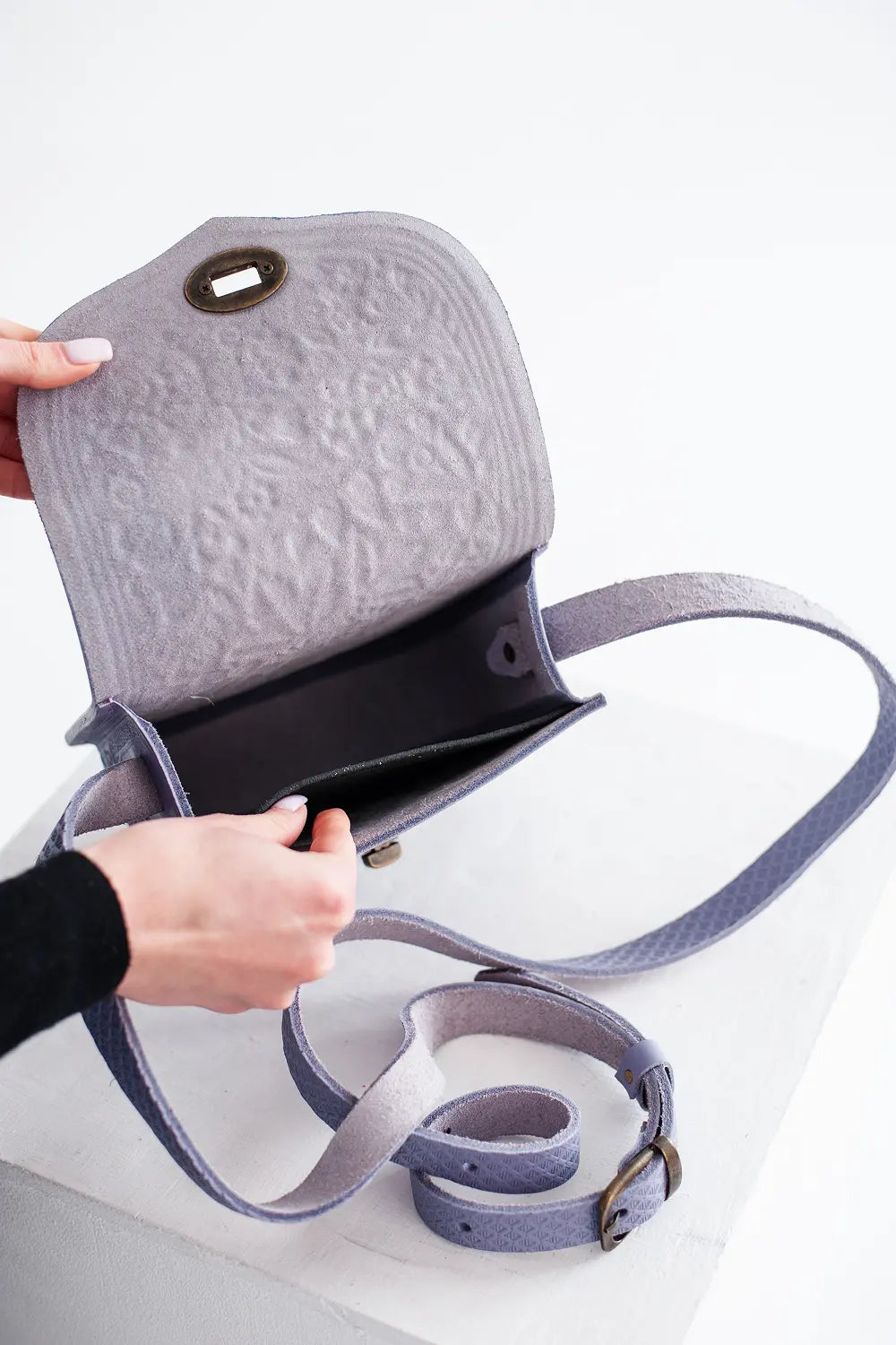 Our small 'Flower' handbag with a rectangular shape and a charming floral ornament. This handmade bag features a genuine leather pocket inside and a long, adjustable strap for easy wear.